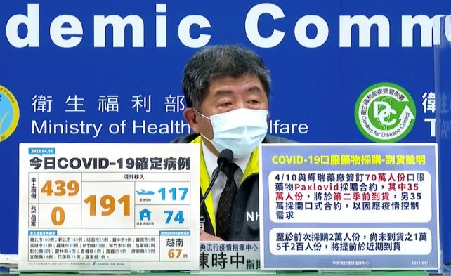 指揮中心公布,11日新增之439例本土病例,為216例男性、223例女性,年齡介於未滿5歲至80多歲,發病日介於今(2022)年4月1日至4月11日,其中包含223例為無症狀感染。個案分佈為新北市(145例)、臺北市(100例)、基隆市(36例)、高雄市(32例)、桃園市(25例)、花蓮縣(21例)、宜蘭縣(14例)、新竹縣(12例)、新竹市及屏東縣(各10例)、臺中市(9例)、嘉義縣及臺南市(各6例)、彰化縣(5例)、雲林縣(4例)、苗栗縣(2例)、嘉義市及臺東縣(各1例)。相關疫情調查持續進行中。
