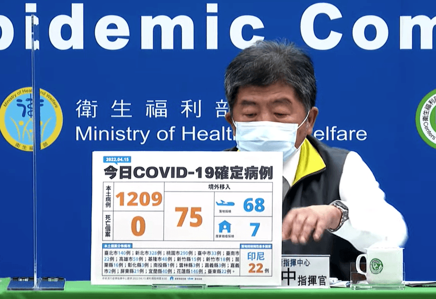指揮中心表示,今日新增之1209例本土病例,為548例男性、660例女性、1例調查中,年齡介於未滿5歲至90多歲,發病日介於今(2022)年3月30日至4月15日,其中包含710例為無症狀感染。個案分佈為新北市(328例),桃園市(290例),花蓮縣(146例),臺北市(140例),高雄市(58例),基隆市(48例),宜蘭縣(40例),臺中市(33例),臺南市及臺東縣(各22例),屏東縣(21例),新竹市(18例),苗栗縣(16例),新竹縣(15例),嘉義縣、雲林縣及彰化縣(各3例),嘉義市(2例),南投縣(1例)。相關疫情調查持續進行中。
