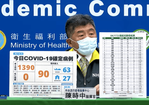 指揮中心表示,今日新增之1,390例本土病例,為699例男性、687例女性、4例調查中,年齡介於未滿5歲至90多歲,發病日介於今(2022)年4月6日至4月18日,其中包含715例為無症狀感染。個案分佈為新北市(500例),臺北市(270例),桃園市(187例),基隆市(115例),宜蘭縣(68例),花蓮縣(57例),臺中市(41例),高雄市(31例),臺南市及屏東縣(各21例),新竹市(20例),臺東縣(14例),新竹縣(13例),嘉義縣(10例),南投縣(7例),雲林縣(6例),苗栗縣(5例),彰化縣(3例),澎湖縣(1例)。相關疫情調查持續進行中。