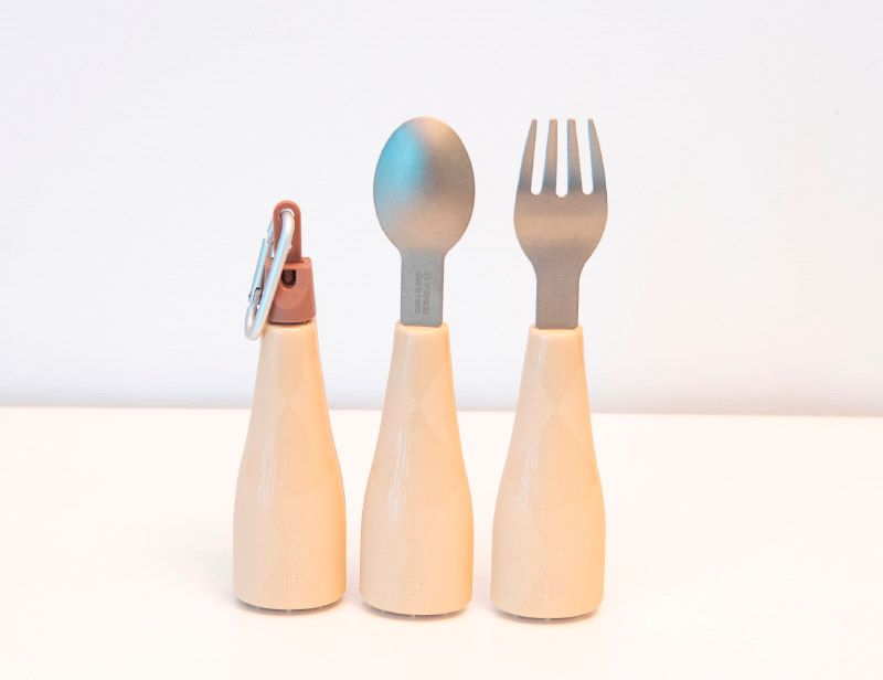 中鋼表示,環保餐具的湯叉金屬部件採純鈦製作,塑料部件添加日本抗菌材質,且其旋轉式拆疊收納方式更具使用便利性,此外,湯叉件採用吊板及吊套獨特設計組合,並採用開轉扣匙面不碰手設計、餐具置放時不接觸桌面,均為鑫科公司的特別設計。