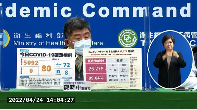 指揮中心表示,今日新增之5,092例本土病例,為2,446例男性、2,641例女性、5例調查中,年齡介於未滿5歲至90歲以上,發病日介於今(2022)年2月23日至4月24日,其中包含2,957例為無症狀感染。個案分佈為新北市(1,731例),桃園市(1,071例),臺北市(1,027例),基隆市(301例),花蓮縣(182例),臺中市(150例),高雄市(147例),宜蘭縣(122例),新竹縣(57例),彰化縣(56例),臺南市(47例),屏東縣(40例),雲林縣(38例),臺東縣(29例),苗栗縣(24例),新竹市(20例),嘉義市(17例),嘉義縣(15例),南投縣(11例),金門縣(4例),連江縣(2例),澎湖縣(1例)。相關疫情調查持續進行中。