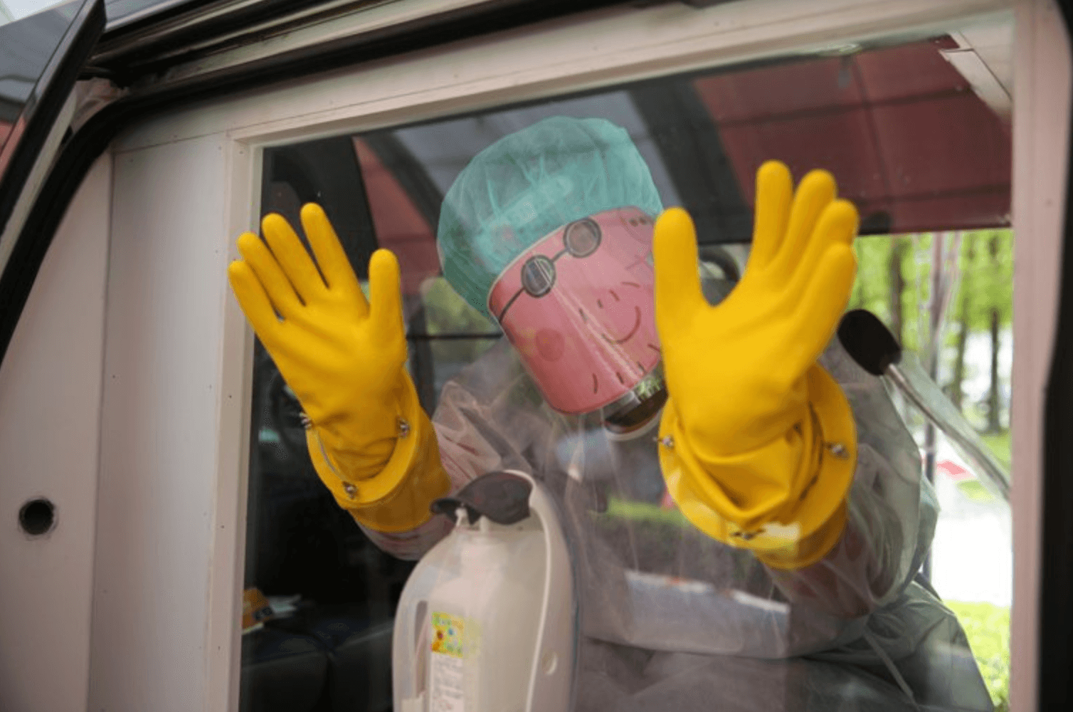 花蓮慈院兒科團隊為了更親近孩子,讓在篩檢站的值班醫師戴上孩子熟悉的卡通人物面罩,例如蜘蛛人等,27日就有醫師戴上卡通《粉紅豬小妹》裡頭,「豬爸爸」的面具,希望讓孩子轉移注意力、心情更放鬆,能降低採檢的恐懼感。