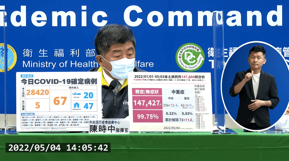 指揮中心指出,今日新增5例本土病例死亡個案,為2例男性、3例女性,年齡介於20多歲至90歲以上,皆屬重度感染個案。確診日介於今(2022)年4月27日至5月2日,死亡日期介於4月29日至5月2日。