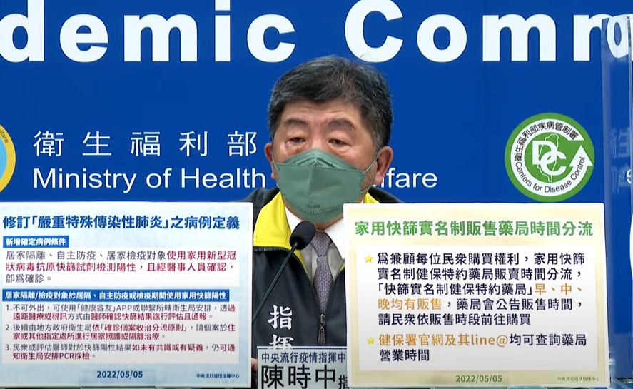 指揮中心指揮官陳時中5日宣布,修訂「嚴重特殊傳染性肺炎」的病例定義,居家隔離、自主防疫和居家檢疫者,只要用家用快篩陽性,經由醫事人員確認,即為確診,自12日起實施。快篩陽性的這3類民眾不可外出,可使用「健康益友」APP或聯繫所在地衛生局,以遠距醫療或視訊方式確認快篩結果,並進行評估與通報。