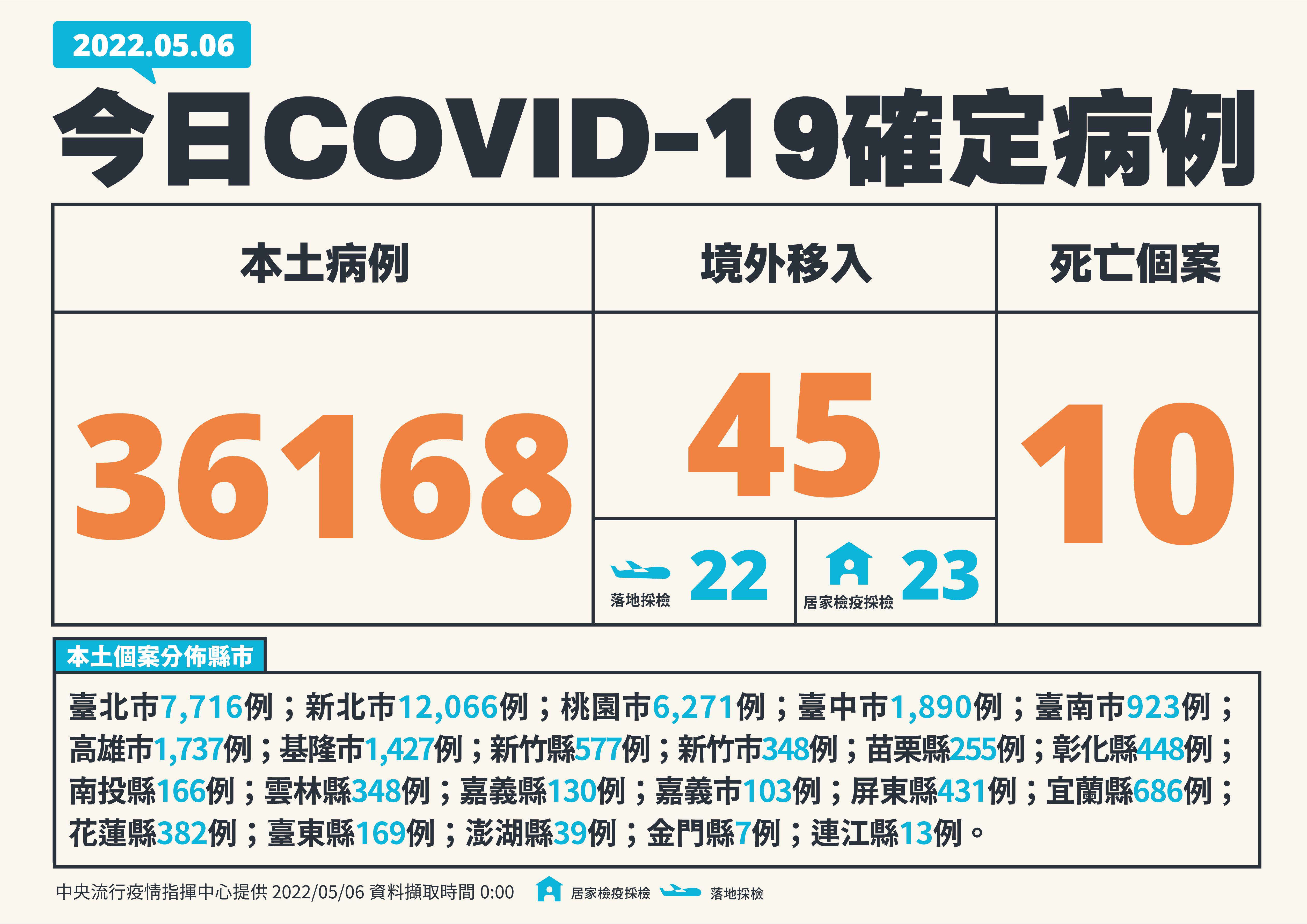 中央流行疫情指揮中心6日公布國內新增36,213例COVID-19確定病例,分別為36,168例本土個案及45例境外移入(22例為航班落地採檢陽性);另確診個案中新增10例死亡,其中1例死亡,是30多歲男,未接種過疫苗;中症新增72人、重症新增15人。指揮中心同時宣布,即日起增加公費PCR核酸檢驗採檢服務診所,請民眾前往時,先以電話預約聯繫,確認服務時段及預約狀況再前往。