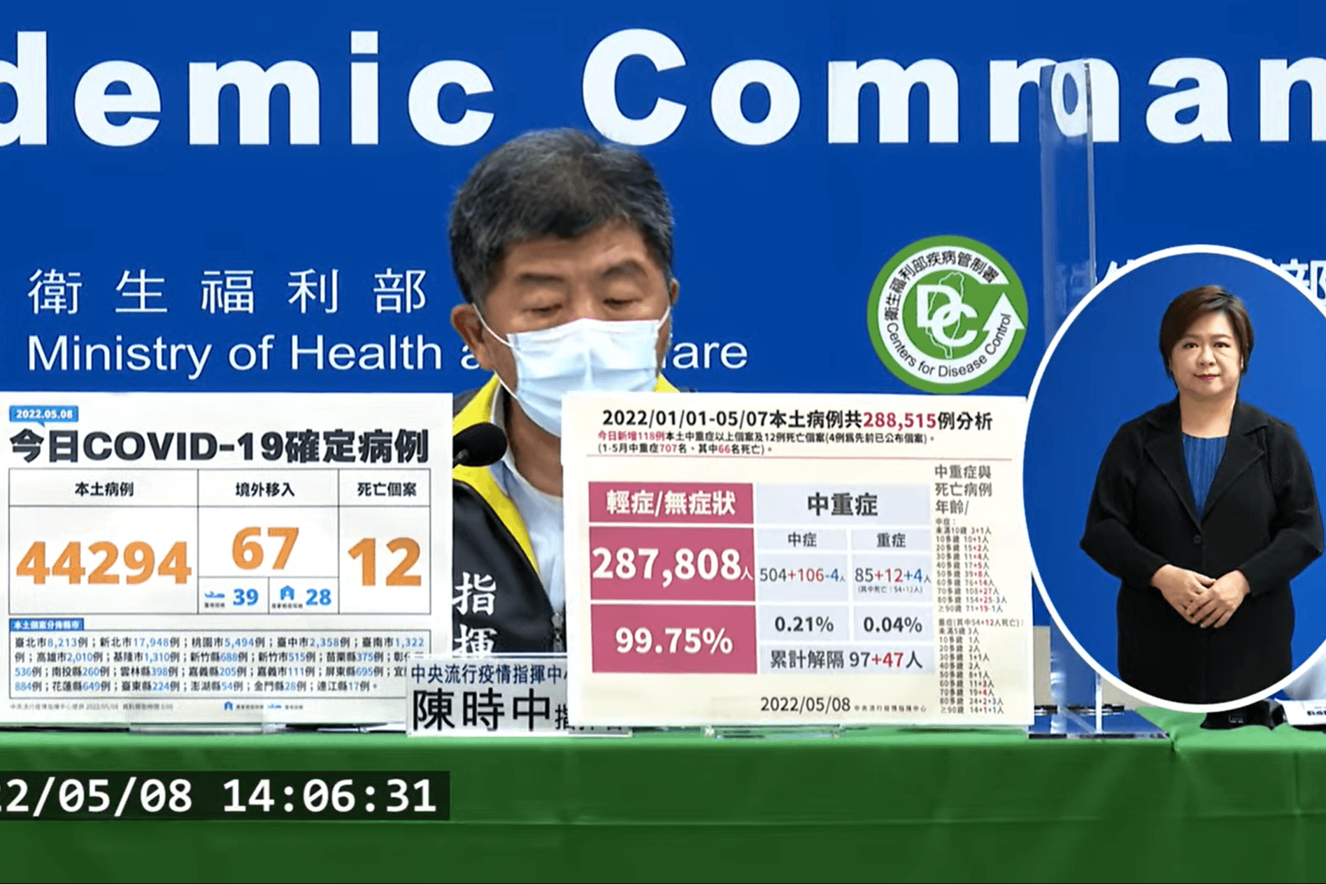 中央流行疫情指揮中心8日公布國內新增44,361例COVID-19確定病例,分別為44,294例本土個案及67例境外移入(39例為航班落地採檢陽性);另確診個案中新增12例死亡。