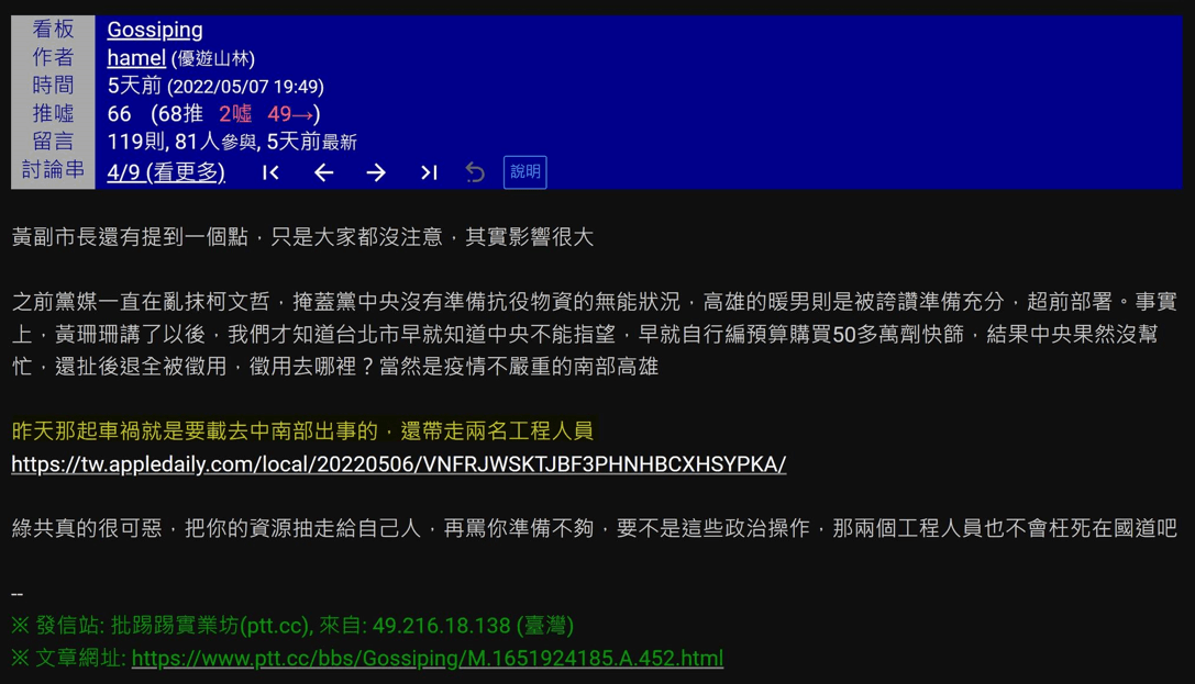 李姓醫師針對這起2死車禍,7日在PTT發文稱這批快篩是「中央徵用台北快篩送至疫情不嚴重的高雄」,內容還寫說:「昨天那起車禍就是要載去中南部出事的,還帶走兩名工程人員。」高雄市府發現後澄清為假消息,並報請高雄刑大偵辦。