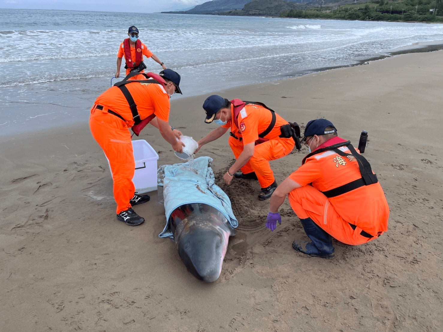 南部分署第六岸巡隊日前才接受海洋保育類野生動物救援教育訓練,今日救援小抹香鯨實際驗收,隊上謹記「三要四不」救援原則,現場用濕布覆蓋小抹香鯨避免嚴重脫水,並將其扶正確保呼吸等器官不會遭受壓迫,經錢獸醫師初步檢查確認為長約180公分、寬約51公分的小抹香鯨,且呼吸心跳穩定。