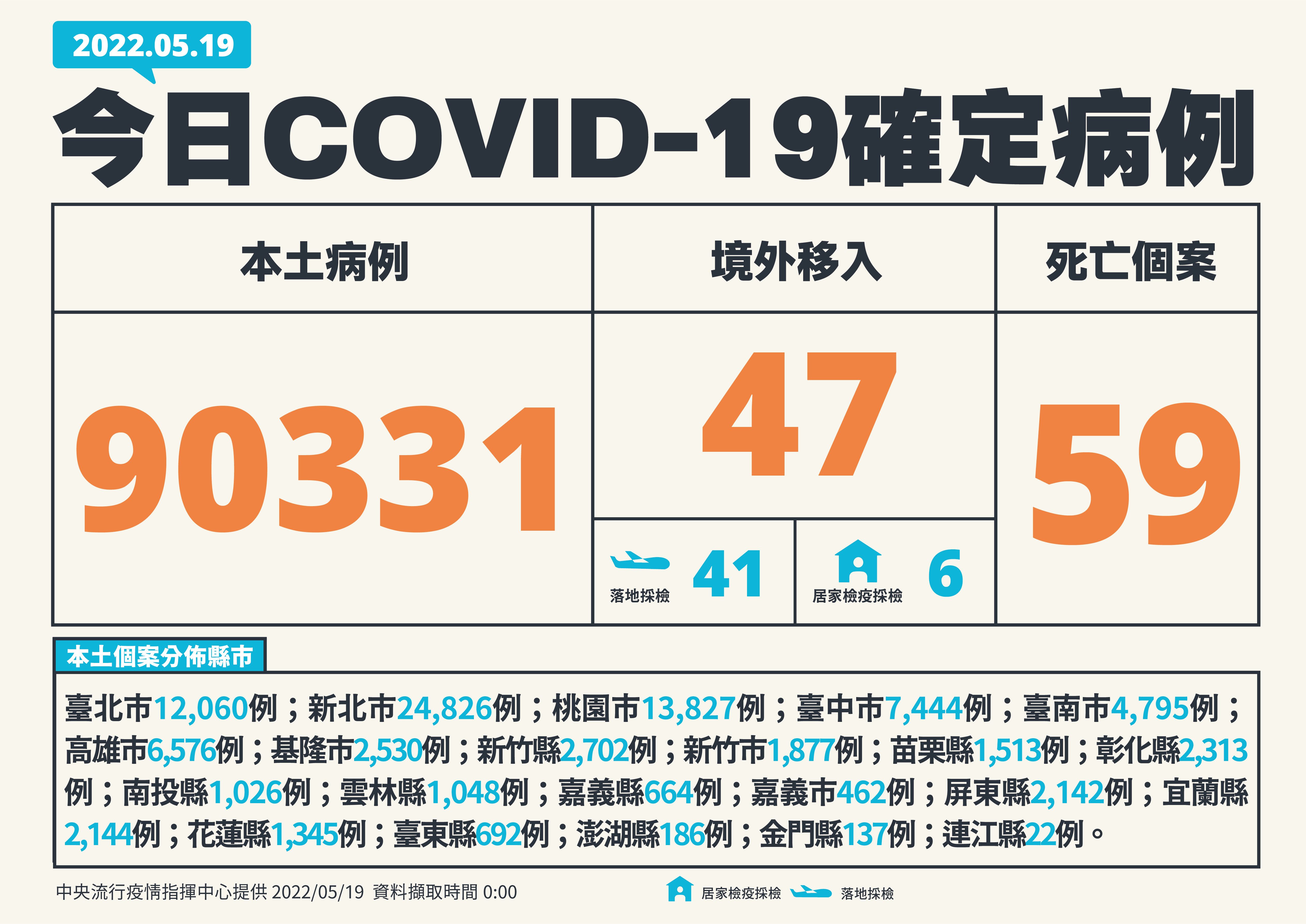 中央流行疫情指揮中心19日公布國內新增90,378例COVID-19確定病例,分別為90,331例本土個案及47例境外移入(41例為航班落地採檢陽性);另確診個案中新增59例死亡,中症新增136人、重症新增55人。