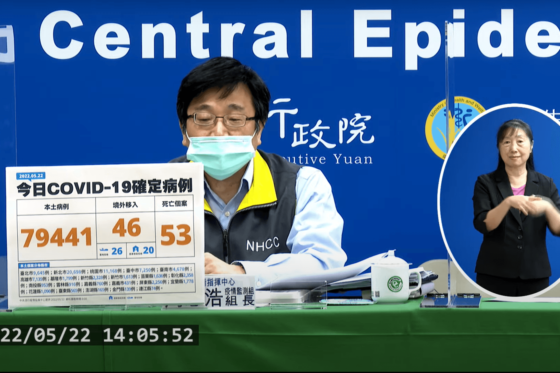 中央流行疫情指揮中心22日公布國內新增79,487例COVID-19確定病例,分別為79,441例本土個案及46例境外移入(26例為航班落地採檢陽性);另,確診個案中新增53例死亡。