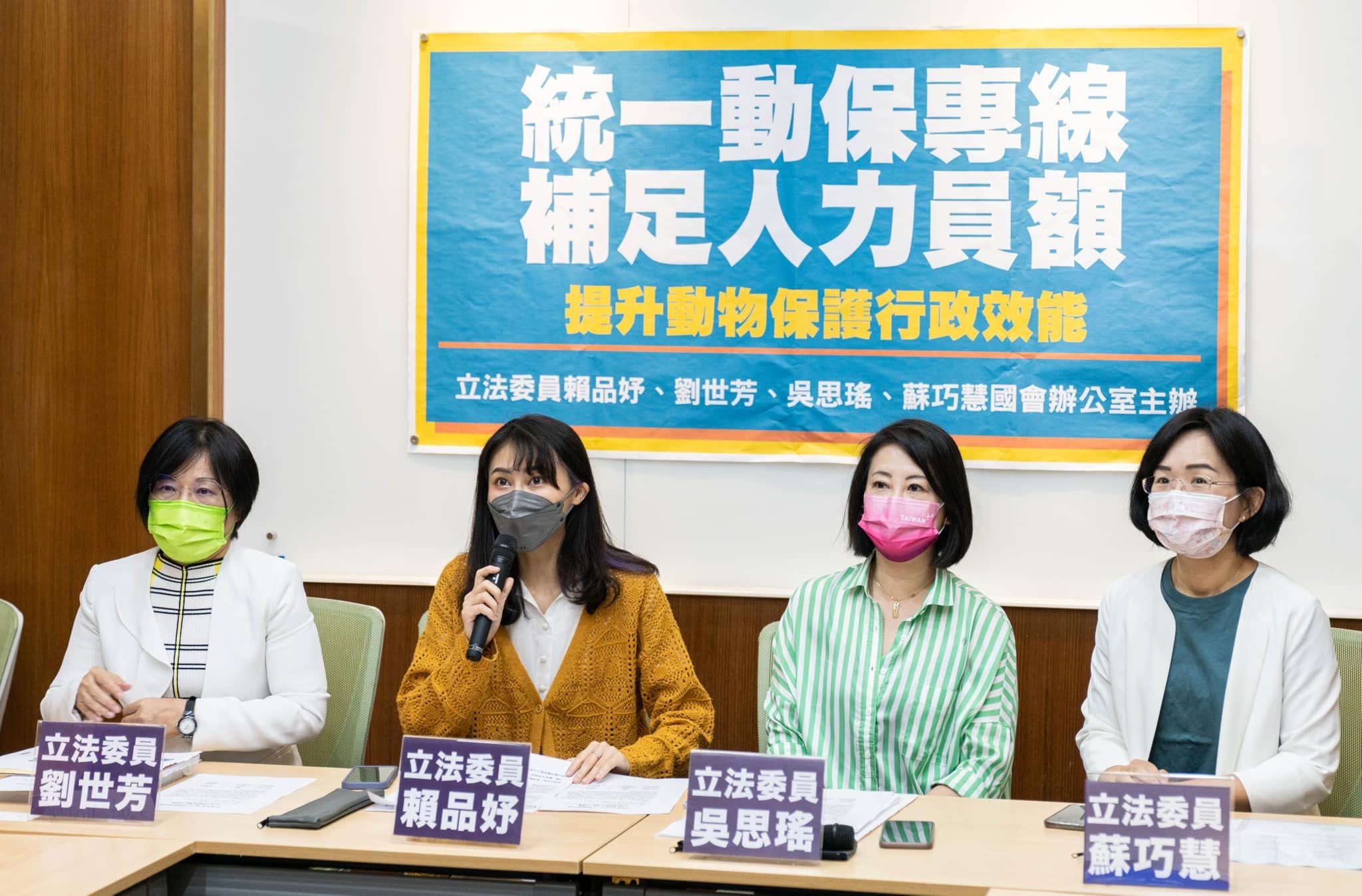 立委劉世芳、賴品妤、吳思瑤、蘇巧慧23日舉行「全國動物保護四碼專線記者會」,關切動保議題。賴品妤指出,全台光是寵物犬貓的數量已達到295萬隻,更首度超過0至14歲的人口數289萬,但截至2022年4月,全國負責動保案件稽查的動保檢查員只有167人,且各地人力不均,有縣市動保檢查員有20幾人,有些縣市卻只有個位數的人力,因此促請農委會能補足地方動保機關業務人力。