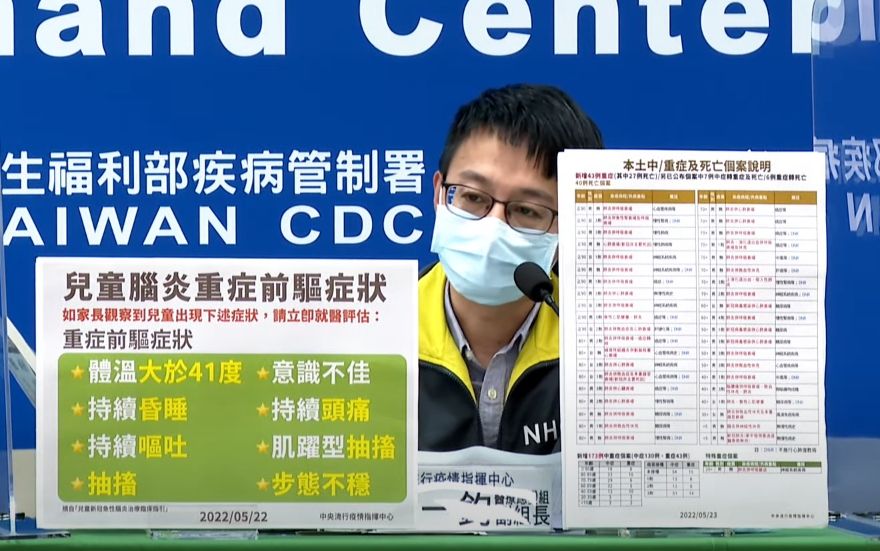 23日台灣增加173例中重症個案,當中有130例中症、43例重症,另外有40例死亡個案,當中有2例是兒童,其中1人併發腦炎死亡,據統計,台灣目前累計14例兒童重症,其中有6例腦炎、4例死亡。