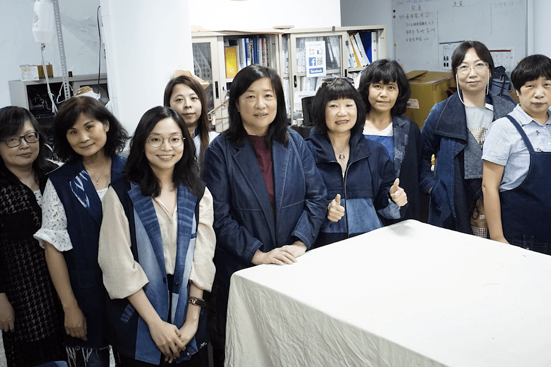 影片中也邀請到國內社創專家方元沂教授來分享和對談,順便介紹了利用牛仔庫存布和回收牛仔褲重新製作出的「一杯袋」,以及把咖啡麻袋改制成咖啡杯墊,也逐一介紹工坊姊妹裁縫人生的辛苦歷程和精湛手藝,在這裡,大家就像一個大家庭彼此相互照應、彼此學習更多的裁縫技術,最後大家都穿上新知工坊為零廢棄時裝Story Wear所製作的外套和圍裙拍照留念,記錄著台灣女力為循環經濟、友善地球而努力的美麗軌跡。