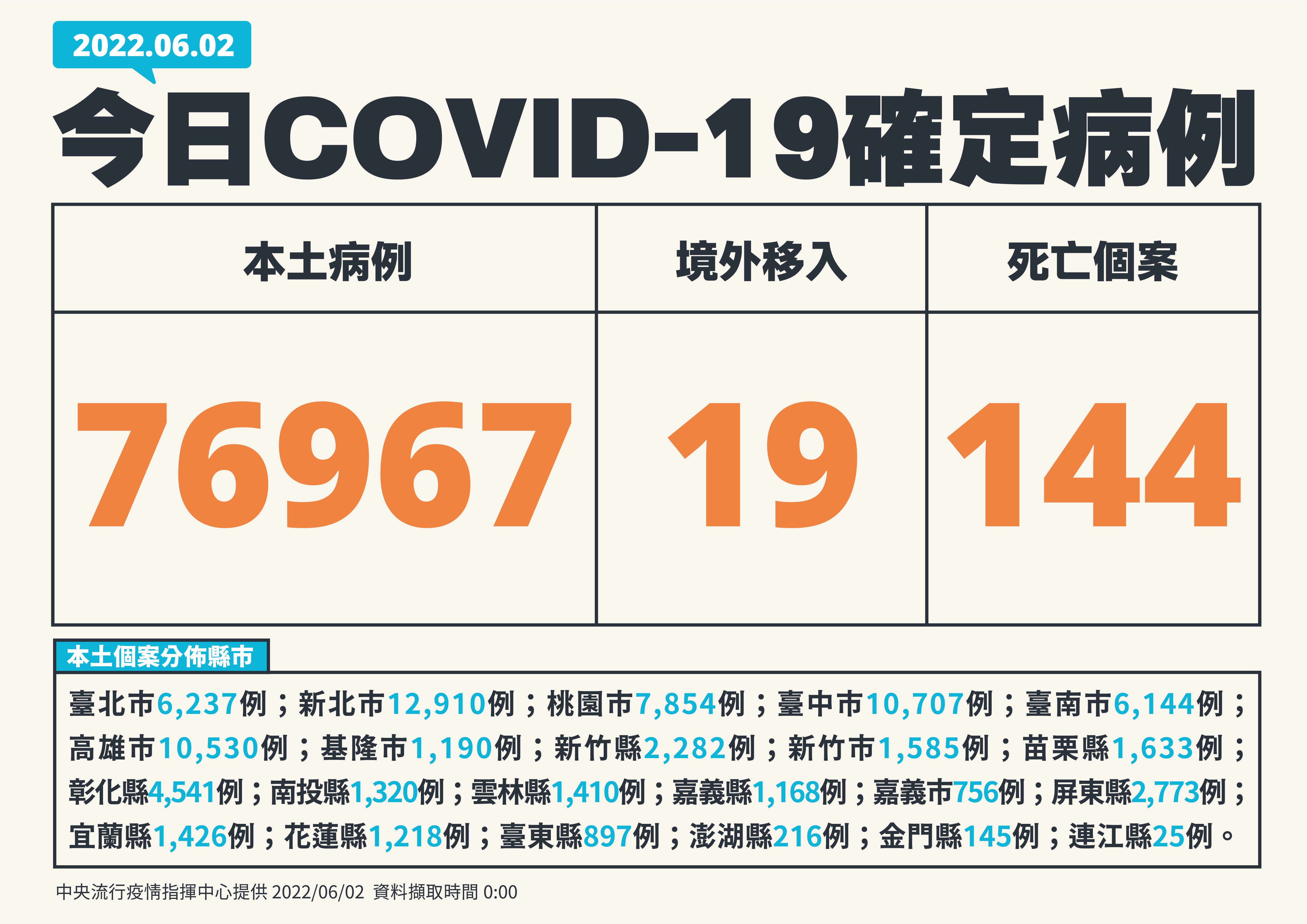 中央流行疫情指揮中心2日公布國內新增76,986例COVID-19確定病例,分別為76,967例本土個案及19例境外移入;另確診個案中新增144例死亡,其中有1位9歲男童在家中死亡,從有嘔吐症狀到死亡僅兩天;中重症新增413例。指揮中心表示,10位兒童腦炎個案都有改善,有4位順利出院,其餘6位都沒有使用呼吸器。