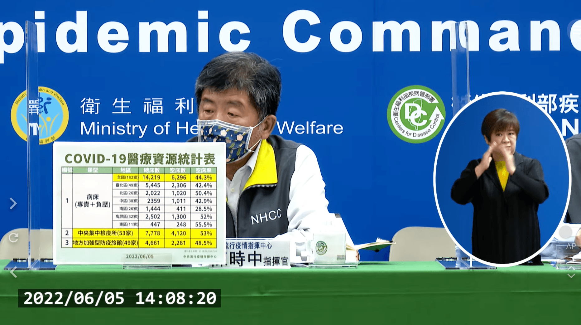 指揮中心統計,截至目前國內累計11,616,037例新型冠狀病毒肺炎相關通報(含9,217,657例排除),其中2,404,871例確診,分別為13,161例境外移入、2,391,656例本土病例、36例敦睦艦隊、3例航空器感染、1例不明及14例調查中。2020年起累計2,939例COVID-19死亡病例,其中2,924例本土,個案居住縣市分布為新北市1,108例、臺北市638例、臺中市182例、高雄市146例、桃園市118例、基隆市114例、臺南市104例、彰化縣94例、屏東縣74例、宜蘭縣70例、花蓮縣63例、雲林縣42例、臺東縣37例、南投縣34例、新竹縣24例、嘉義市23例、苗栗縣及嘉義縣各21例、新竹市6例、金門縣4例、澎湖縣1例;另15例為境外移入。