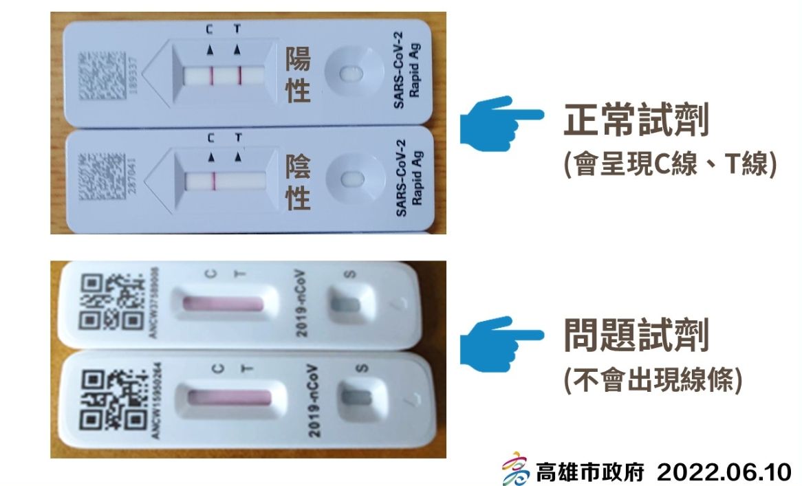 高雄市衛生局表示,有民眾向台中市政府反映,美國進口快篩試劑「Flowflex富樂」有瑕疵,出現測試線(T)、控制線(C)同時沒有顯示線條的形況,高雄市也採買到同一批快篩試劑,庫存約10萬劑左右,目前已在5月25日至6月9日發放部分快篩,不過至今未接獲任何民眾反映,上午進行緊急抽樣,也沒有類似問題。