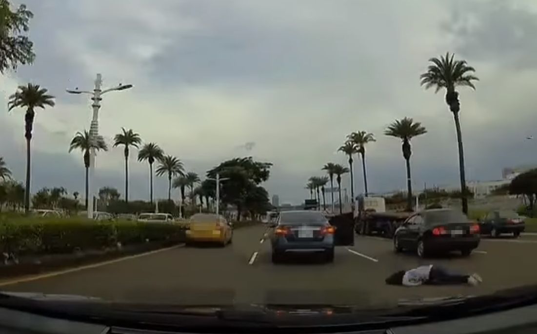根據後方車輛提供的行車紀錄器,當時車速約為50上下,前方黑色轎車副駕駛門突然打開,一名長髮女子掉出車外,女子右膝蓋與小腿著地瞬間,後腦杓還疑似撞到車後輪,翻滾好幾圈後趴地不動,疑似失去意識,後車立刻向左閃避,才沒有輾過該名女子,前車見狀也馬上停車。