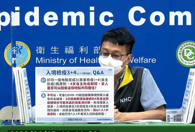 醫療應變組副組長羅一鈞15日在疫情記者會上表示,因目前邊境攔截到Omicron亞型變異株BA.4及BA.5,可能會交叉感染、造成家庭群聚,因此不會放寬「1人1戶」的原則,並依序說明其他的Q&A。