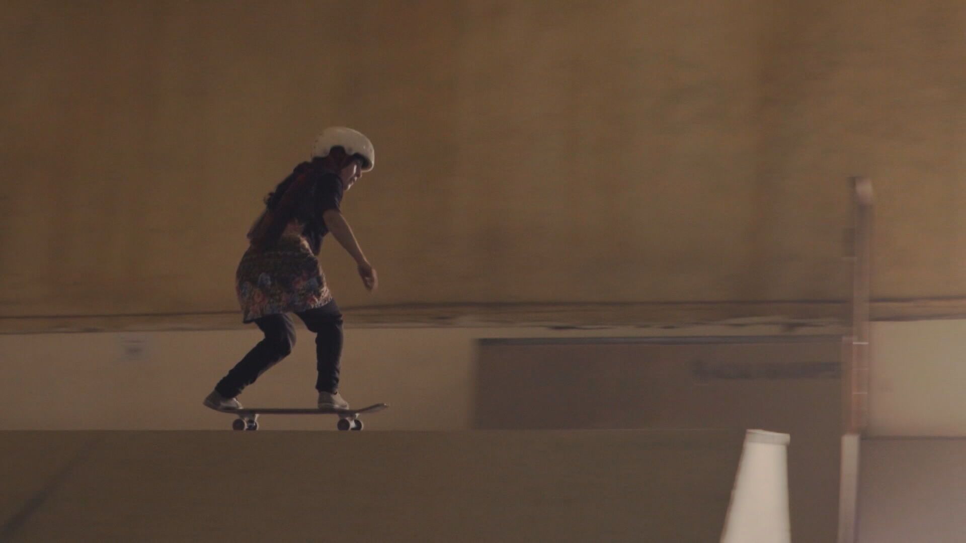 戴上頭盔、護膝,安全裝置戴好戴滿,在教練的帶領下,阿富汗的女孩們開始溜滑板,滑板教練指導:「第二步,輕輕放上來,動作不要太大。」向著坡道緩緩前進,跌跌碰碰,抓好平衡感覺,跌倒後再試一次,以勇氣克服恐懼。