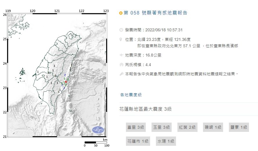 18日上午10點57分台東發生芮氏規模4.4地震,震央位於台東縣長濱鄉,深度16.8公里,最大震度台東長濱鄉、花蓮富里都有3級,氣象局地震測報中心主任陳國昌表示,這起地震是323大地震的餘震,因為323大地震是921之後排名第6的地震,所以餘震持續半年是很正常的。