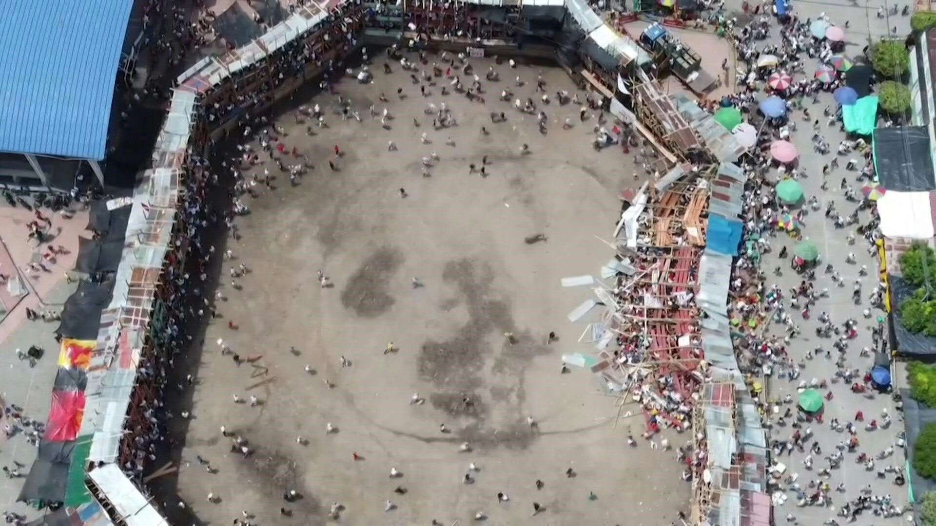 南美洲國家哥倫比亞,托利馬省艾斯皮納市(El Espinal)一處鬥牛場,26日發生觀眾台倒塌意外。這座鬥牛場中間是表演場地,外圍環繞一圈觀眾看台,約3層樓高,不過疑似為木造材質,26日看台其中一部分向內崩塌,上面人山人海的觀眾猶如「骨牌」一般跌落地面,目前尚不清楚倒塌原因為何。