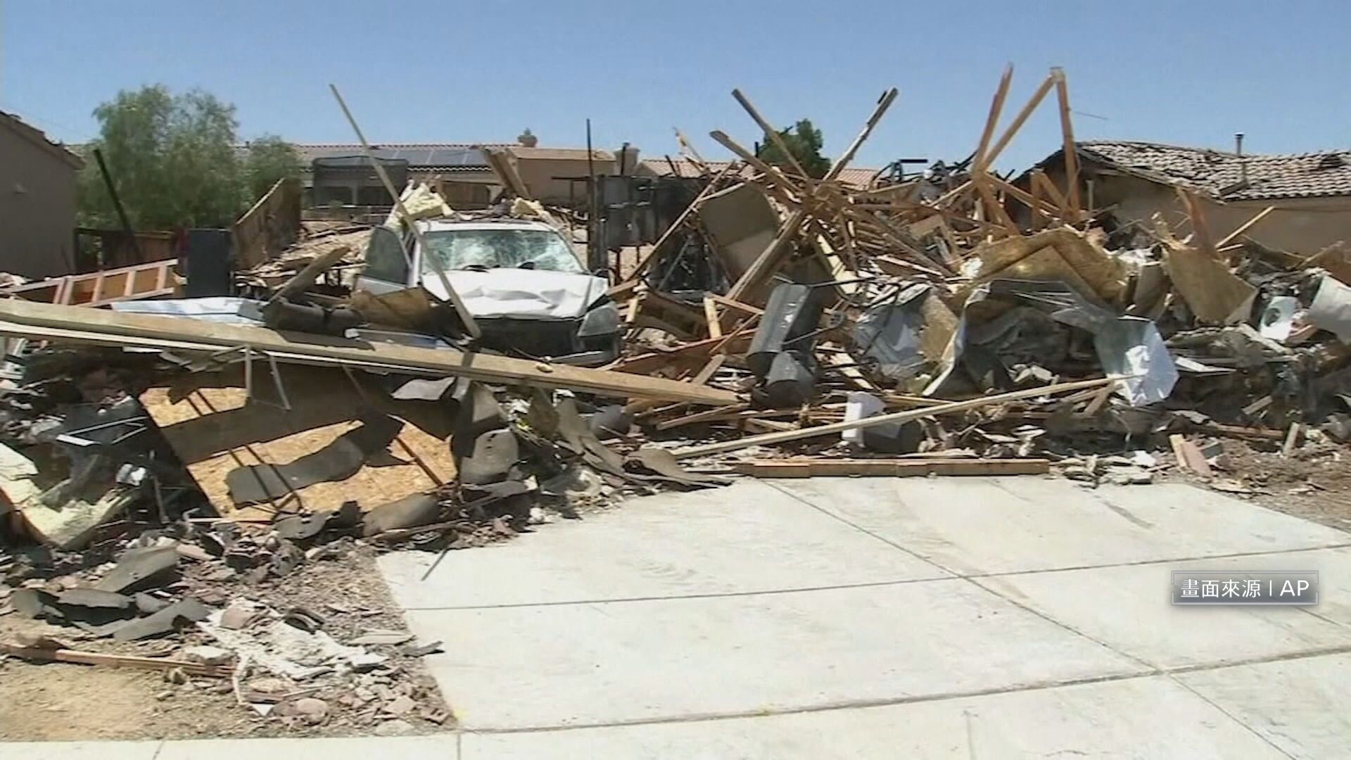 整棟房子已經被爆炸夷為平地、面目全非,旁邊至少兩棟房子也遭到波及,而爆炸引發火災,造成一位居民燒傷,被空運到創傷中心。這起意外發生在聖貝納迪諾郡的 維克多維爾,距離洛杉磯東北 大約一小時的車程。爆炸原因正在調查當中。
