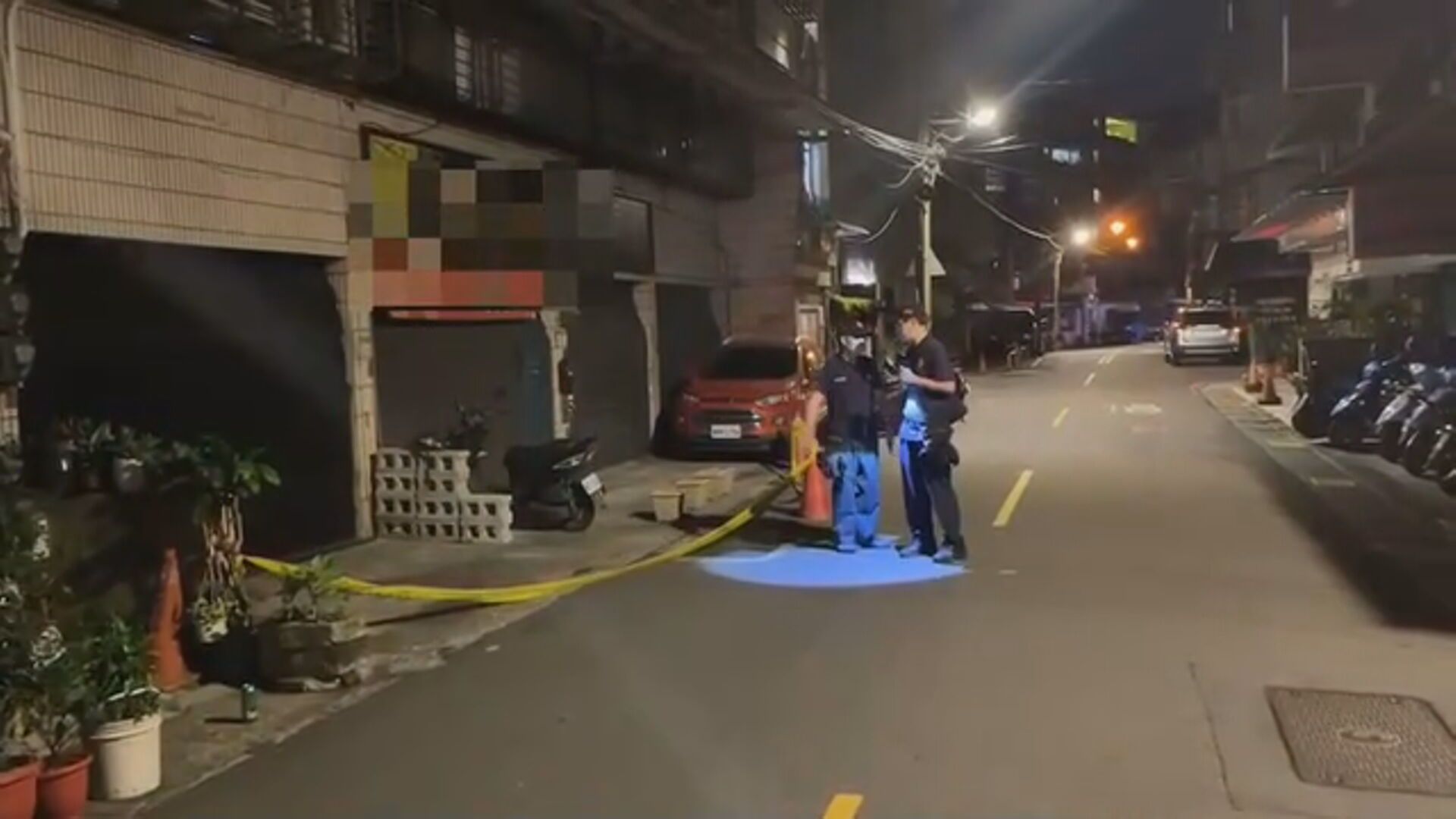 在監視器畫面中可看到,一名男子鬼鬼祟祟,走進巷子,最後坐計程車離開。原來他不久前到中和一間歇業已久的茶行,對鐵捲門連開三槍。可以看到門上還留有明顯彈孔,警方獲報後抵達現場,也在第一時間進行採證。