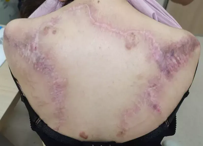 一名27歲的陳姓女子,10幾年前在國小升國中時,不慎抓破後背的2顆青春痘,傷口反覆感染之下,竟長出如「巨蟲」般的蟹足腫,背部隆起的範圍達到「20*30*20」公分,甚至蔓延至前胸,除了搔癢難耐外,還嚴重影響睡眠及工作,且只能穿著寬鬆衣物,造成生活諸多不便,所幸求醫後已完成切除治療,追蹤2年暫無復發。