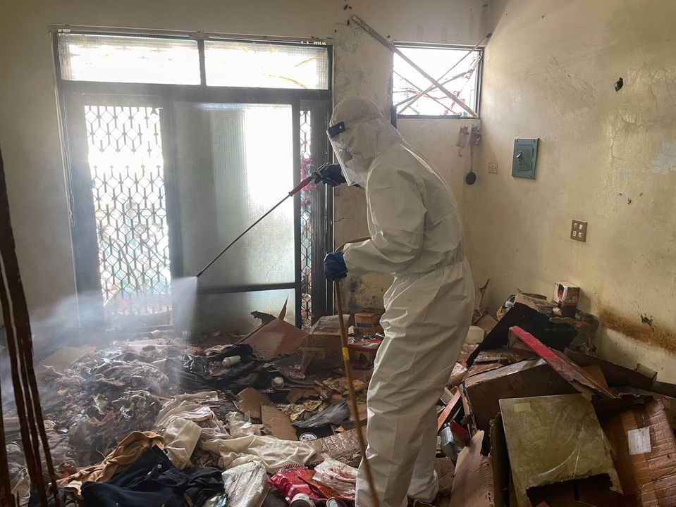 環保局28日出動36名清潔人員挺進3樓,總計3天下來已清出一般垃圾15噸、1080公斤資源回收,還有1輛廢棄汽車、2台廢棄機車、冰箱和魚缸,因清理過程中常有老鼠、蟑螂竄出,清潔人員不敢大意,皆著完整裝備,全副武裝清理,目前還有4樓及地下室待清理。