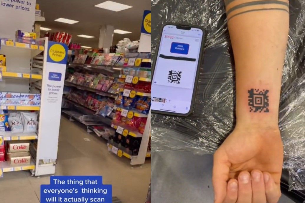 兩名男子來到超市,隨手抓了一條餅乾就急著結帳,其他顧客按部就班拿出會員卡掃描結帳,可英國這名男子卻伸出右手,秀出手臂上的「QR Code刺青」結帳。