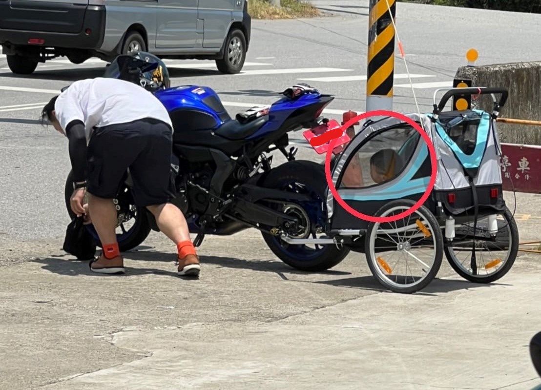 男子於重機後方加掛拖車載兒,行經苗栗縣台3線三灣鄉路段時,被民眾目擊、拍照PO網,男子事後更在車友LINE群組中分享拖車載兒照片,並聲稱是以時速60騎車,還表示「這樣環島也不是問題」。