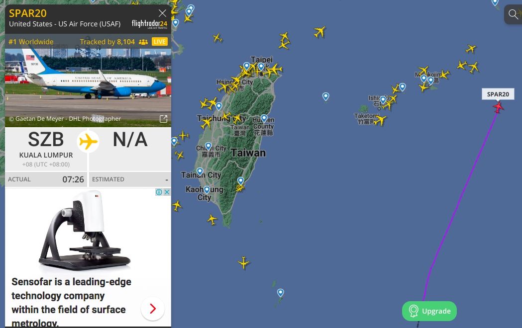 根據即時航班飛行資訊網Flightradar24顯示,SPAR20運輸機今日上午7點26分從馬來西亞蘇丹阿都阿兹沙機場起飛,幾乎和昨日裴洛西專機飛行路徑相同,避開南海及中國飛行情報區後,朝菲律賓薩馬島東北方飛行,外界猜測是否降落台灣,不過最新路徑顯示,SPAR20已飛離台灣東側,於日本時間15:37降落沖繩嘉手納空軍基地。裴洛西亞洲行讓美國空軍運輸機航線備受關注。