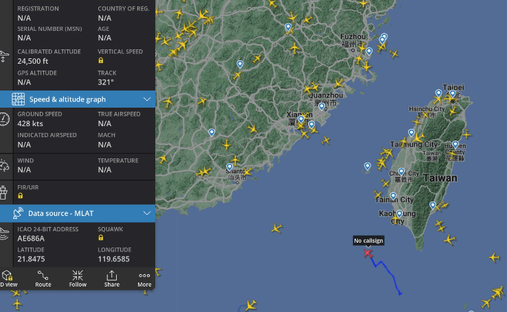 因解放軍舉行軍演,7個海空域也被宣告船隻飛機禁行飛行、航行,不過在4日接近中午12時,有網友在即時航班追蹤網站「Flightradar 24」發現一架顯示關閉呼號(No callsign)的飛機,突然從巴士海峽飛入解放軍進行軍演的空域,後來關注全球軍事軍機的推特帳號「CANUK78」證實,這是美國海軍P-8A「波賽頓」海上巡邏機