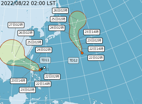 位於菲律賓東方海面的熱帶性低氣壓,凌晨2時距離鵝鑾鼻東南方約790公里,有發展為輕度颱風的趨勢,未來以通過呂宋島進入東沙島海面再往廣東前進的機率較高,預計最快晚上有機會成為今年第9號颱風 「馬鞍」,預估23、24日最接近台灣,發布海陸警機會不大,東南部等地有雨,但路徑仍有不確定性,請留意最新的天氣預報;今天凌晨2時形成的第12號熱帶性低氣壓,未來也有發展為輕度颱風的趨勢,距離相當遙遠,對台灣沒有影響。