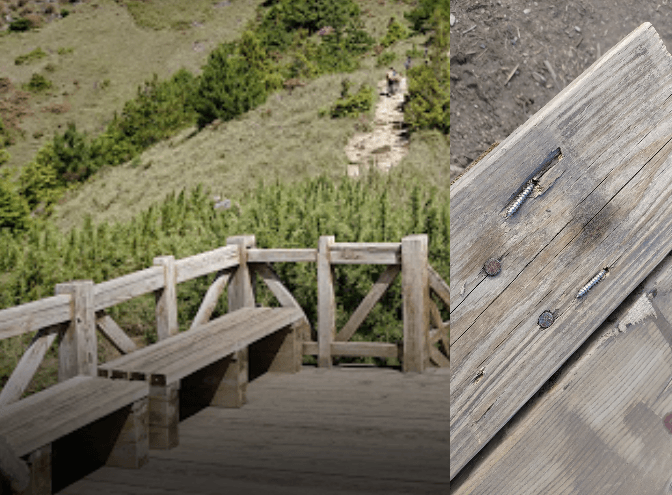 一名山友23日在臉書社團「登山通報站」發文表示,原先哭坡觀景台的休憩椅上出現釘子凸起情況,同行友人的褲子不慎被釘子勾破,但還好沒有傷到皮肉,並PO出照片提醒其他山友們小心。
