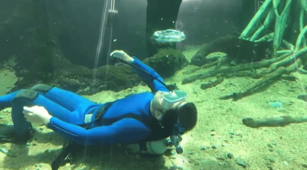 栃木縣那珂川水族館官方推特日前PO出一段影片,影片中只見一名飼育員穿著潛水服,躺在水族箱的底部,臉部朝上,並從口中吐出一圈圈「天使光環」的泡泡,而該水族館也表示,「雖然我們沒有白鯨,但我們有很會吐泡泡的飼育員」,並表示「不是每個人都做得到喔」。