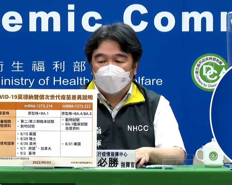 食藥署2日通過莫德納次世代疫苗EUA,不過該疫苗效用主要針對BA.1變種病毒,而非此波主要流行的BA.5,因此引發爭議。王必勝對此解釋,該疫苗已獲WHO、英國、歐盟等地認可,同樣能防範BA.5。據目前消息,原始株+BA.5的二價疫苗年底才有機會供貨,國內則先從原始株+BA.1疫苗開始施打。
