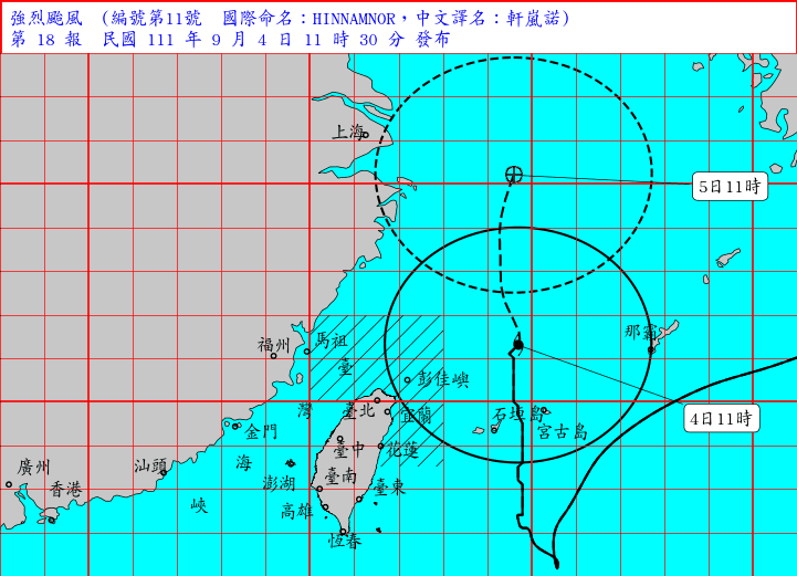目前軒嵐諾颱風位置在台北東北東方約350公里海面上,以每小時17轉21公里速度,向北轉北北東進行,近中心最大風速每秒 51 公尺(約每小時 184 公里),相當於 16 級風,瞬間最大陣風每秒 63 公尺(約每小時 227 公里),相當於 17 級風以上。
