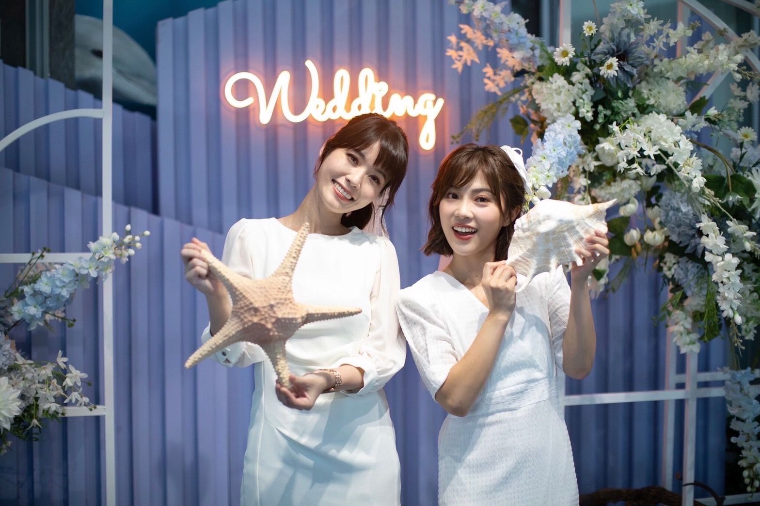 2人也分享,拍攝當天清晨5點多就出門,連續拍攝10小時,一口氣走訪岡山、旗山、美濃、鹽埕、大寮、旗津等6個各具特色的背板取景,衣著呈現有別於工作時的輕便休閒風,在旗津海洋風背板前,特地換上輕婚紗,應景「海灘逐浪奔愛」的浪漫主題。