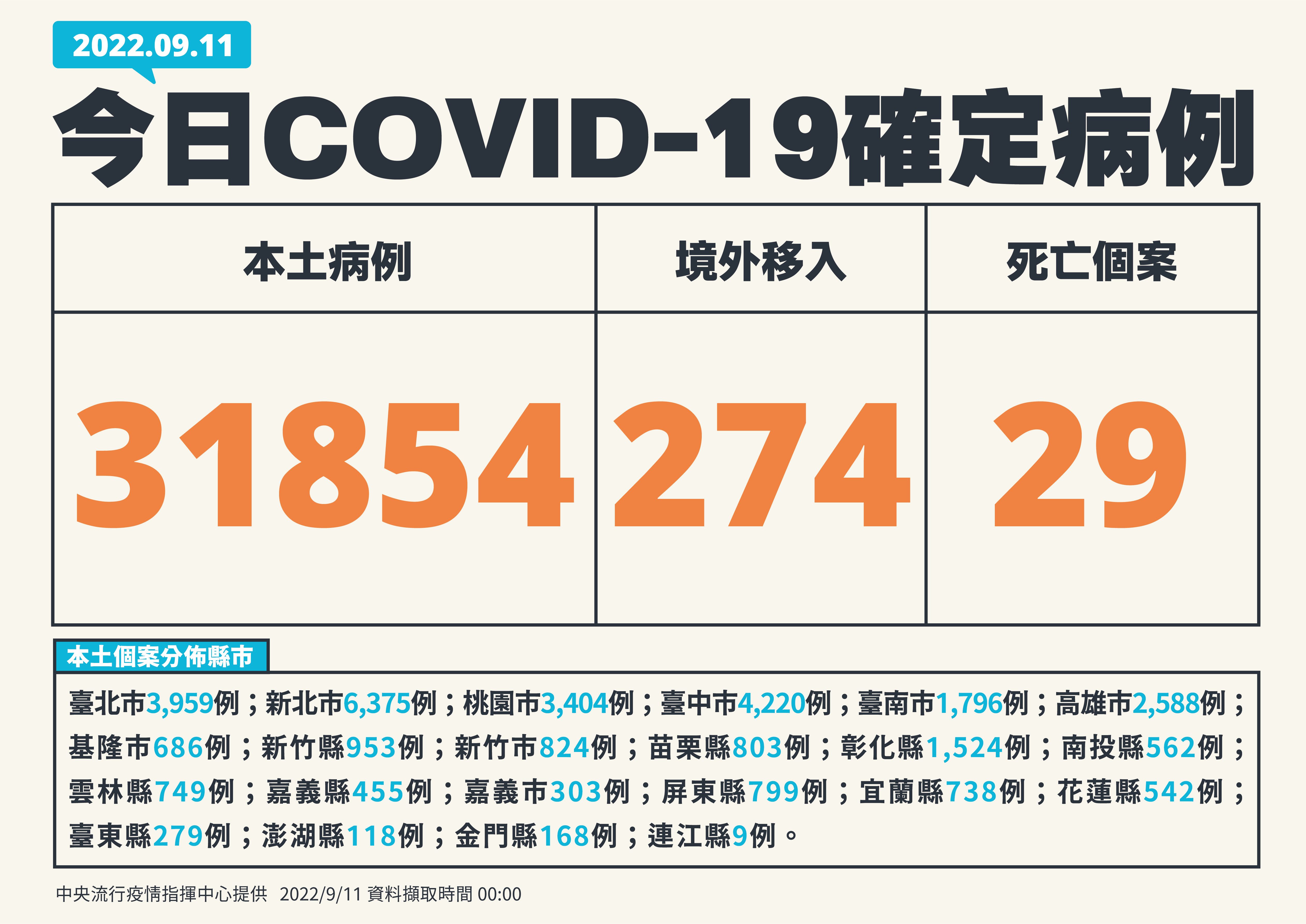 指揮中心指出,今日新增29例本土病例死亡個案,為14例男性、15例女性,年齡介於50多歲至90多歲以上,皆屬重度感染、28例具慢性病史、20 例未接種3劑以上COVID-19疫苗。確診日介於今(2022)年7月11日至9月8日,死亡日期介於8月25日至9月8日。