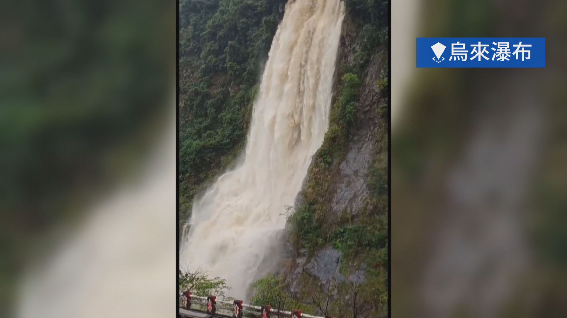 滾滾泥水不斷往下沖,新北市烏來的五重溪瀑布,水勢彷彿水庫洩洪。同樣景象,烏來瀑布水勢又大又急,甚至路面積水,計程車得冒險涉水而過,梅花颱風還在台灣外海,外圍環流就替新北市烏來帶來龐大雨量。