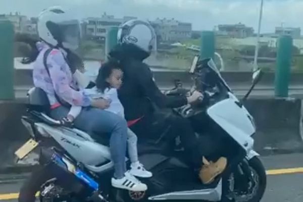 有網友11日於臉書社團發布影片,指出在台61線西濱快速道路口湖段上,出現一輛疑似一家四口共乘的黃牌重型機車,機車騎士看起來是父親,母親靠著機車後方背墊,中間夾著一名男童與一名女童,男童還在母親懷中睡得頗為安穩,不過仔細一看,兩名孩童都沒有戴安全帽,令人擔憂。