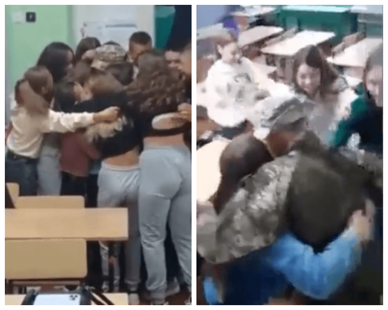 烏克蘭國會議員Inna Sovsun在推特釋出影片,一名老師Roman Palamarchyk穿著軍服來到先前任教的班級,一開門學生們先是愣住,接著不可置信的張大嘴巴,看到最愛的老師安全歸來,全部衝上前抱著老師圍成一團。議員Inna Sovsun提到,學生們一直都很掛念在前線作戰的老師,也時常禱告期望老師能活著回來,如今願望成真。