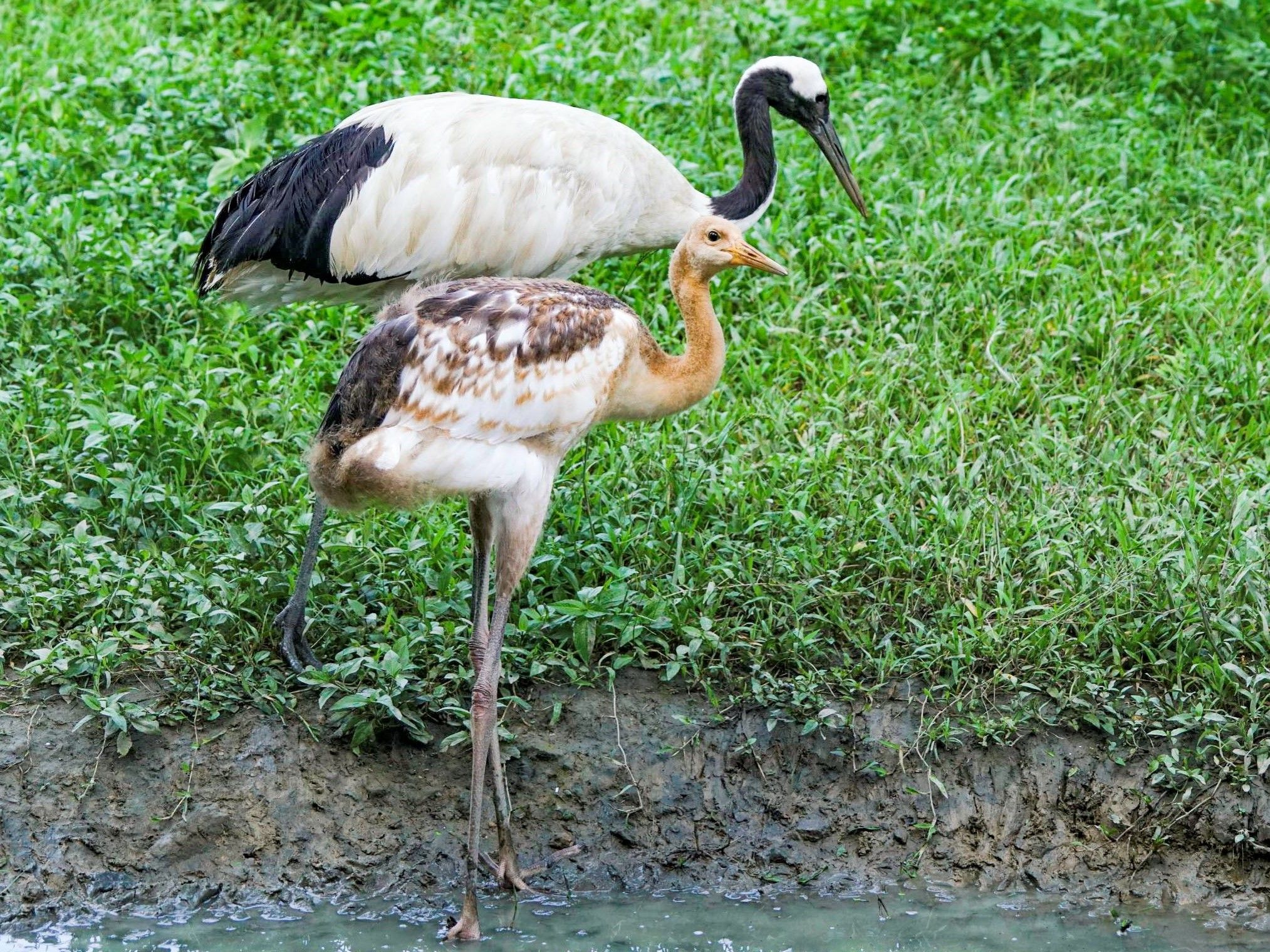 台北市立動物園指出,與日本釧路動物園的丹頂鶴保育合作計畫,從11年前丹頂鶴爸爸「Big」和媽媽「Kika」來到台灣後,就多次嘗試,今年終於繁殖成功!而丹頂鶴寶寶在經過3個月後,由出生時黃澄澄的身子蛻變成一身白色羽毛,身高也幾乎與成鳥相同。