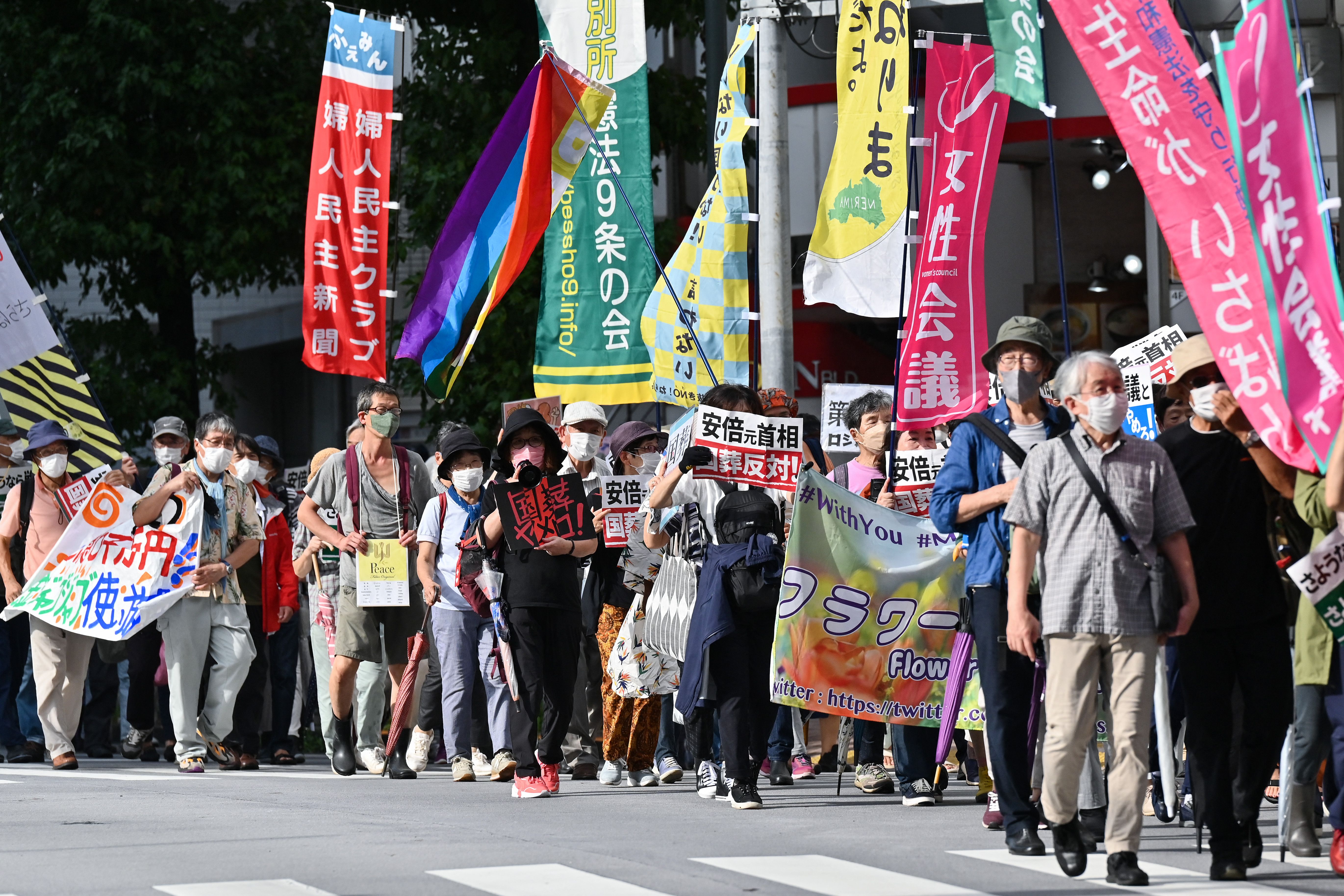 反國葬團體19日不畏颱風南瑪都登陸日本,仍於東京澀谷的代代木公園舉辦遊行活動,號召1.3萬民眾上街,手拿標語、橫幅,邊喊「反對違反憲法的國葬」口號抗議,不過遊行中也發生小插曲,有民眾與警察發生衝突。