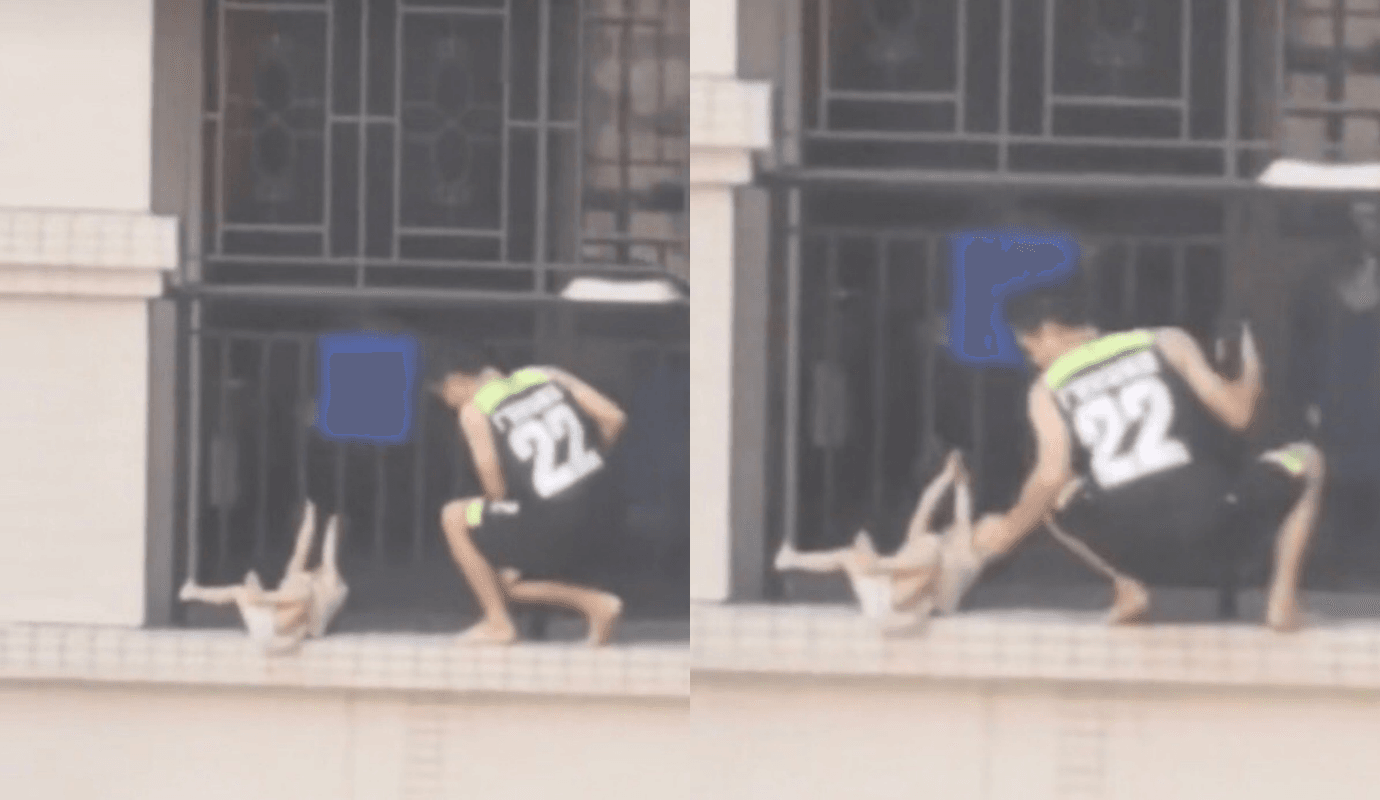 嬰幼兒的安全必須隨時注意。中國廣東25日,一名住在8樓的幼童,頭部被欄杆卡住,整個人的身體就這樣懸空在外,差一點就會不小心從高樓墜落,附近目擊的鄰居都捏了把冷汗,這時有一名英勇的男子從大樓外牆爬到幼兒所在處,搭救這名兒童,所幸最後有驚無險,2人都平安無事。