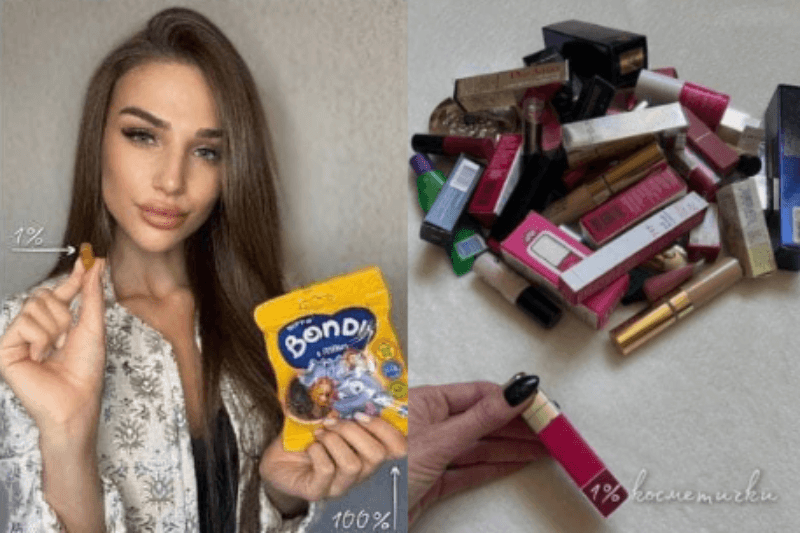美妝部落客伊莎亞(Katrina Isaea)針對「局部動員令」議題發文,她分享一手拿整包糖果、另一手拿一顆糖果的照片,還特別標註「100%、1%」,來宣稱徵召30萬人並不多,動員令的規模其實很小,就如這1%的糖果。另一名網紅維洛契洛娃(Anna Velozelova)則是用一包薯條餅乾來比喻,另也有人以一堆口紅與一支口紅來表達。