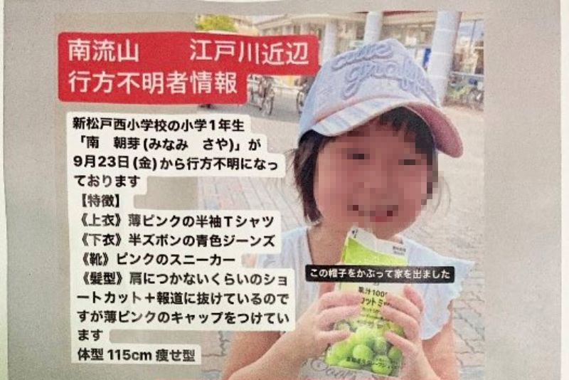 日本千葉縣7歲女童南朝芽9月23日早上11點半獨自出門後就行蹤不明,午間在家裡1公里處被監視器拍下最後身影,23日下午在監視器附近發現她的滑板車,並於24日、滑板車附近300公尺處,一名在江戶川沿岸跑步的人發現女童的鞋襪,接著於29日下午發現帽子,上面有由女童母親寫下的名字。