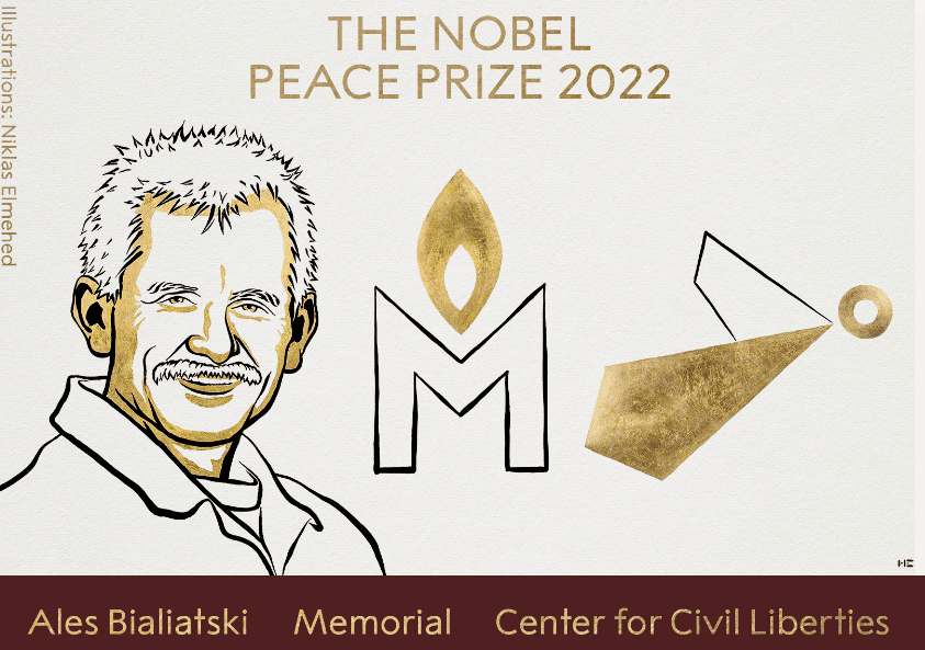 2022年諾貝爾和平獎(Nobel Prize in Peace)7日於挪威奧斯陸公佈,得主由白俄人權倡議者畢亞利亞茨基(Ales Bialiatski)、俄羅斯人權組織「紀念」(Memorial),以及烏克蘭人權組織「公民自由中心」(Center for Civil Liberties)共獲殊榮,以表彰他們為記錄戰爭、侵犯人權及權力濫用做出的努力,此次獲獎聲望很高的烏克蘭總統澤倫斯基(Volodymyr Zelenskyy),則成為本屆遺珠。