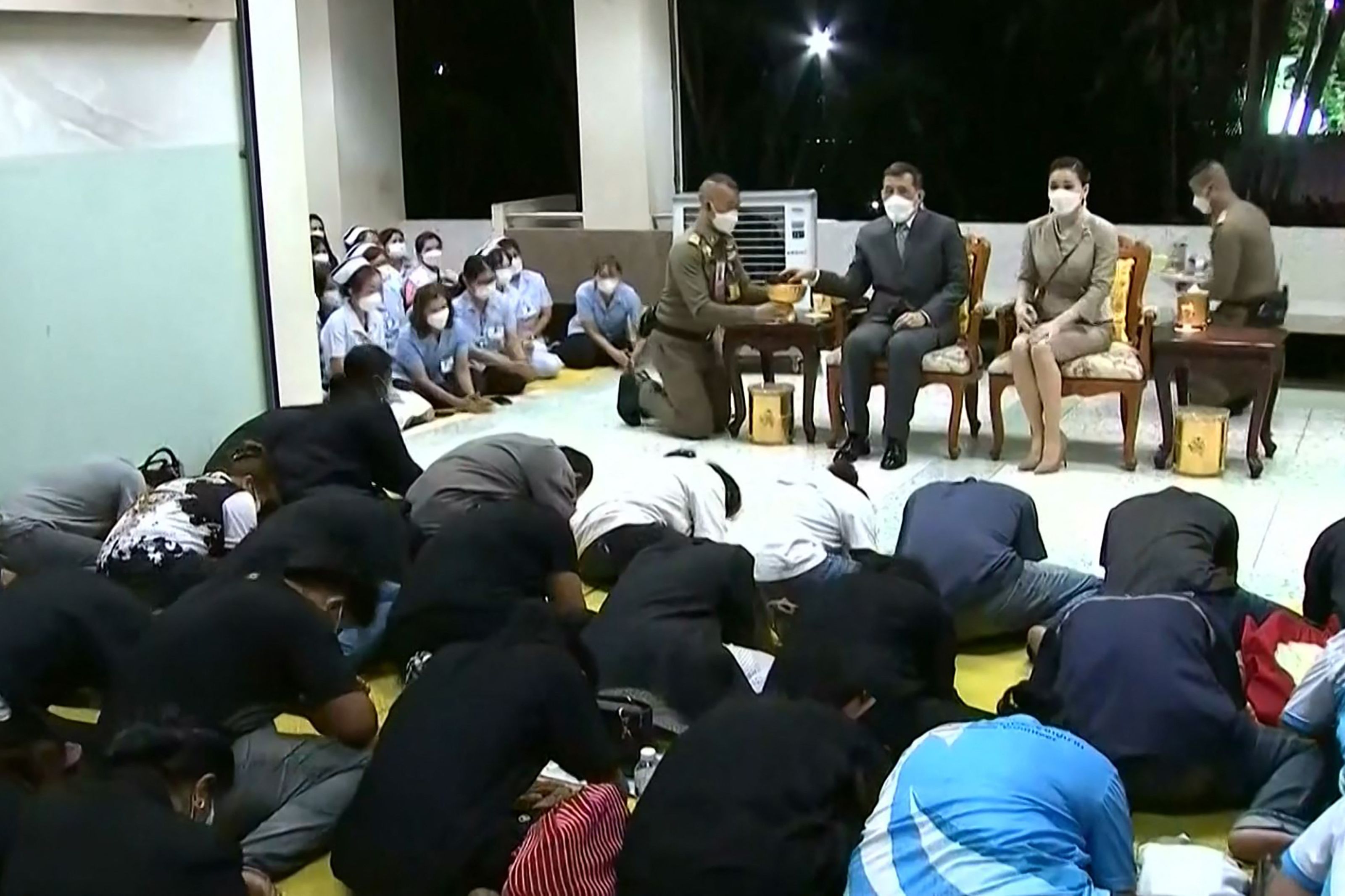 而引起爭議的不僅「紅毯」事件,泰王與王后蘇提達(Suthida )前往醫院探視死傷者家屬前,有人目擊,工作人員在醫院大廳布置起國王與王后的肖像畫。而泰王到場後,稱自己「相當悲痛」,不過傷心欲絕的家屬,竟還要向泰王與王后「匍匐跪拜」行禮,此舉雖算是泰國傳統禮節,但讓痛失至親的家屬下跪,還是引起網友抨擊。